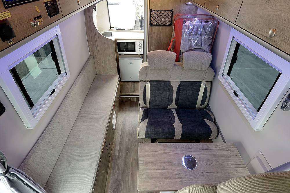 值得一提的是,长条沙发可以把靠背放平,组成一张单人床,主驾座椅和两张座椅都可以放平,把升降桌降低后,组合成一张双人床。