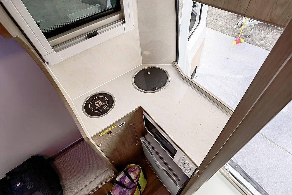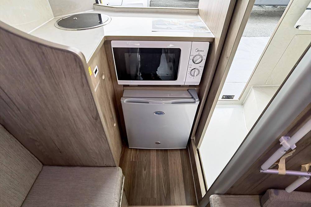 接着看厨房,配备了电磁炉、洗菜盆、50L车载冰箱和微波炉等,台面下方有储物柜,可以盛放锅、碗、瓢、盆、筷子、勺子、调料、糖、盐等厨房用品。做饭时可以把尾窗打开,毕竟没有配备油烟机。