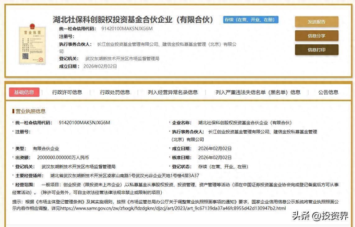 投资界(ID:pedaily2012)消息,2月2日,湖北社保科创股权投资基金合伙企业(有限合伙)在武汉东湖高新区完成工商注册登记。该基金由全国社会保障基金理事会、湖北省、武汉市、中国建设银行共同组建,首期规模200亿元。